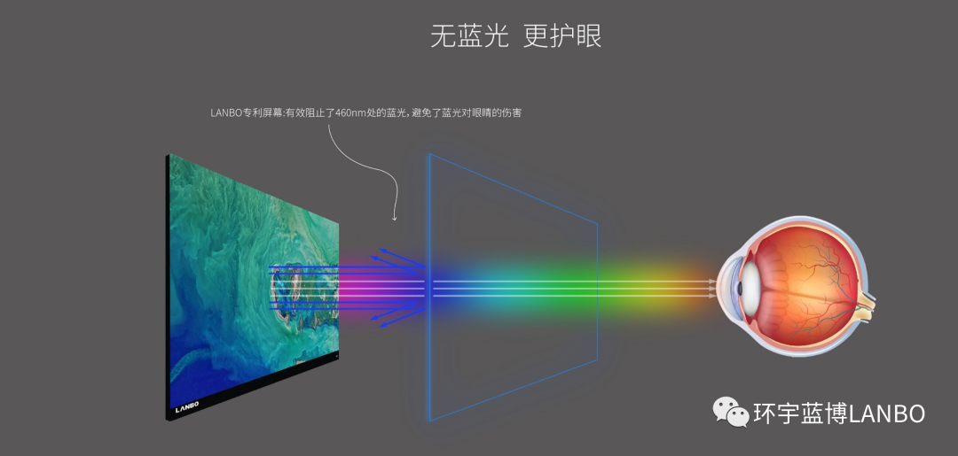 环宇蓝博取得这些辉煌成绩,依托的还是其强大的实力,旗下微距背投最突出的优势就是护眼性能。众所周知,电子产品屏幕所发出的蓝光对我们的眼睛健康有着一定程度的伤害。而环宇蓝博微距背投经中国计量科学研究院蓝光检测,460nm处的蓝光辐射亮度仅为7.12E-03W/m²·sr·nm,相当于液晶电视的1/89,辐射亮度远低于国家标准。同时经中国标准化研究院试验中心“人眼视觉舒适度(VICO)”检测,VICO指数高达1.95,这意味着看环宇蓝博微距背投的视觉体验甚至比看纸质书还要舒适。
