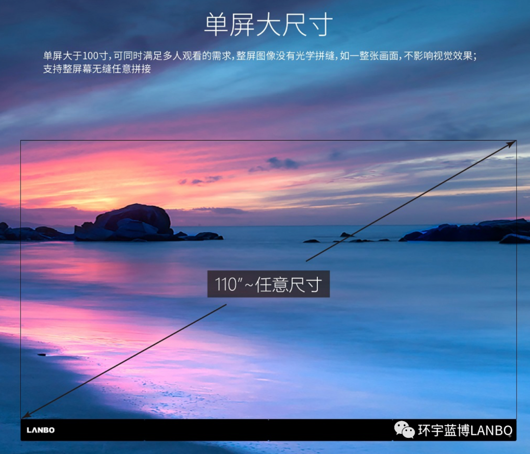 并且,环宇蓝博LANBO单屏大于100寸,整屏图像没有光学拼缝,并可整屏无限任意拼接;通过对微距背投底层的RGB色域调校,实现真实色彩还原;保正良好的灰度和色彩表现的前提下,屏幕亮度可在150-500cd/m²的范围内任意调节,满足多场景应用。