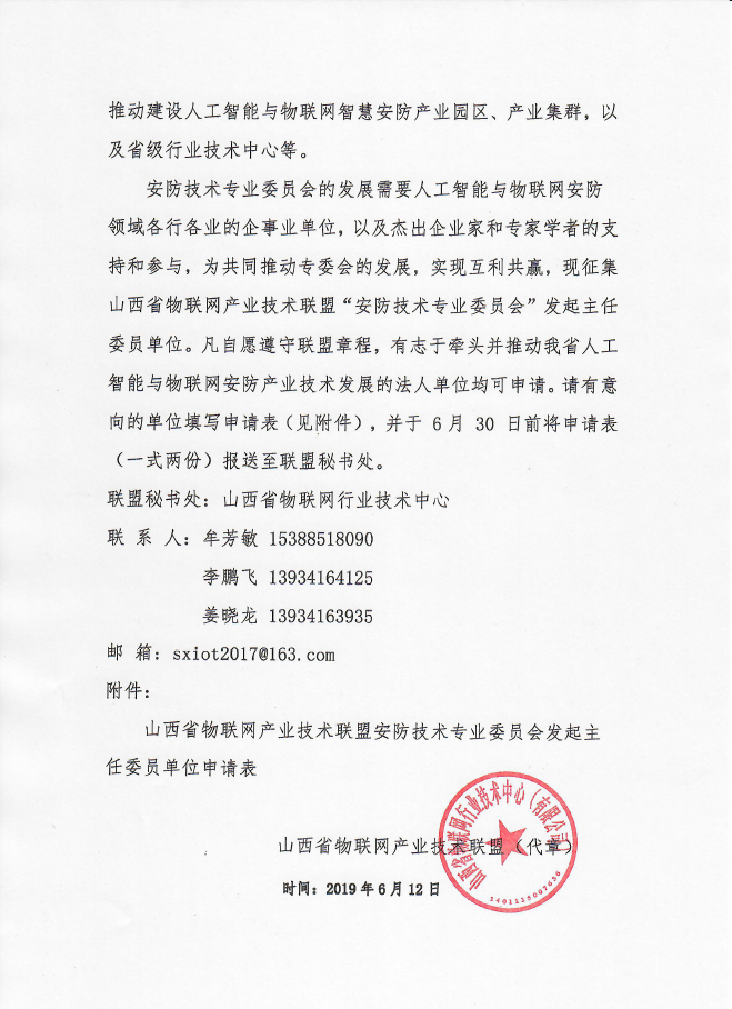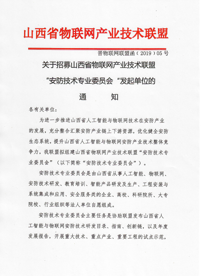 2019年为了推动人工智能和物联网在安防行业当中的发展和应用,由物联网联盟发起筹备成立“人工智能与物联网安防专业委员会”,面向全行业人工智能,物联网,安防行业的厂家,企业,科研院所等招募发起单位。发起单位确认后,发起单位在工信厅和联盟秘书处的监督管理下招募会员并自行运营和管理专委会的具体工作。