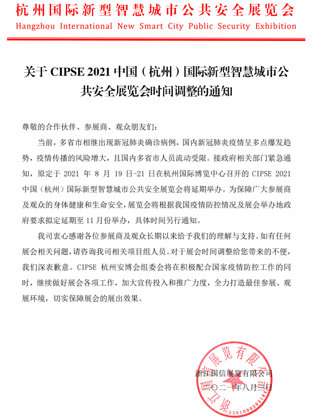 关于CIPSE 2021中国(杭州)国际新型智慧城市公共安全展览会时间调整的通知