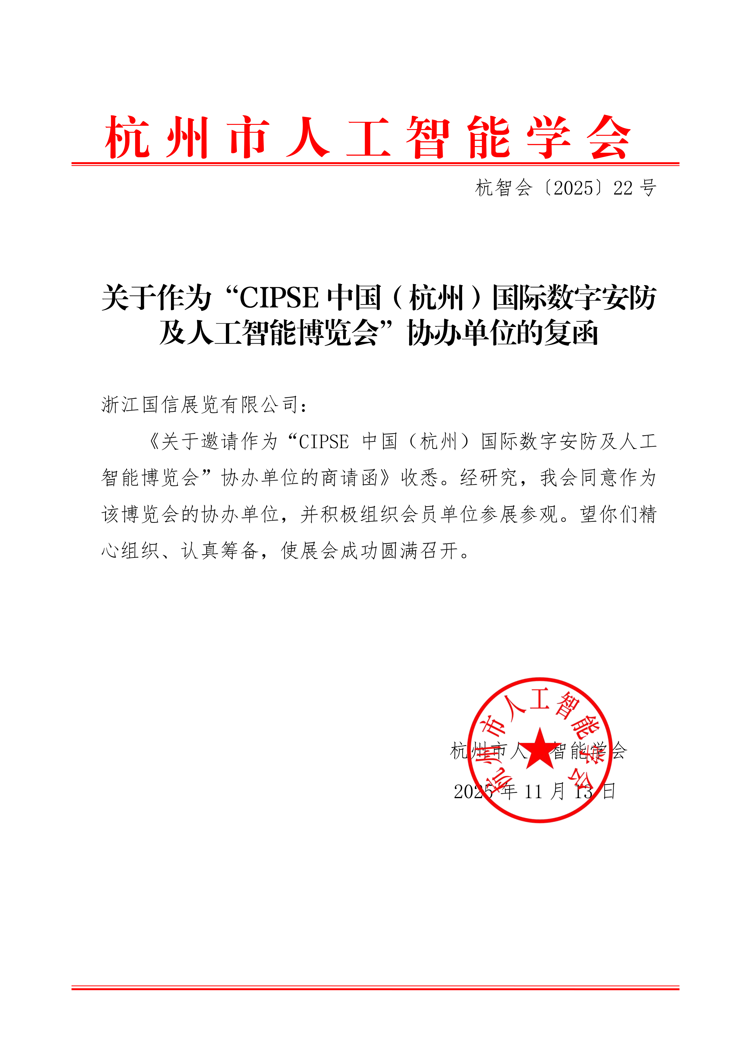 喜讯!杭州市人工智能学会复函同意成为“CIPSE 2026中国(杭州)国际数字安防及人工智能博览会”协办单位 ,将联手推动数字安防及人工智能快速发展!集中呈现人工智能领域的创新成果与未来趋势,搭建跨区域、跨领域的高效对接平台,助力产业生态协同共进、蓬勃发展。